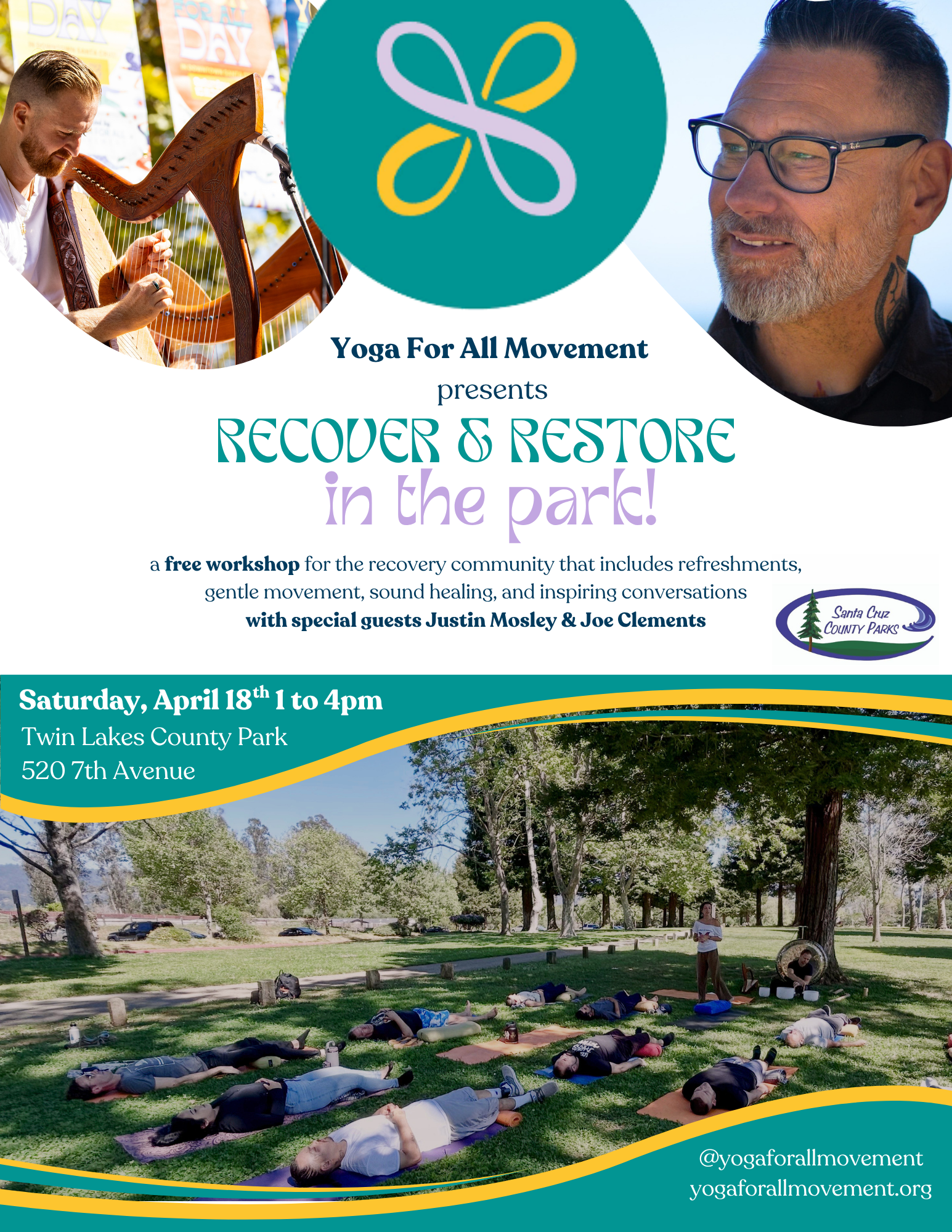 Recover & Restore in the Park: free workshop for recovery community Saturday, April 18, 2026 1:00β―PM 4:00β―PM Pinto Lake Community Park Watsonville, CA United States (map) Google Calendar ICS RSVP